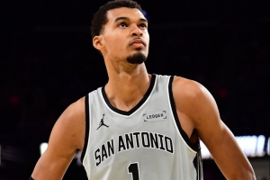 文班亞馬替補(bǔ)出戰(zhàn),他首節(jié)出戰(zhàn)05分13秒,4投1中,三分1投0中、沒(méi)有罰球,拿到2分2籃板,正負(fù)值-6。