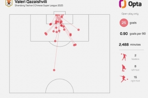 25 – 卡扎伊什維利本賽季在運動戰(zhàn)中攻入25粒進球,刷新自有紀錄以來(2012年),任一球員單賽季中超運動戰(zhàn)進球新高。