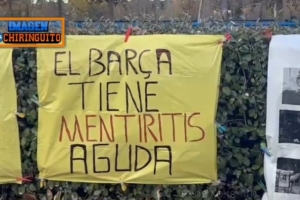 對于拉波爾塔的言論,皇馬球迷顯然有著不同的意見。在俱樂部訓練基地外,皇馬球迷打出了巴薩“撒謊成性”的橫幅。