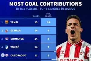 體育資訊12月18日訊 《轉(zhuǎn)會市場》統(tǒng)計了本賽季五大聯(lián)賽U19球員直接參與進球榜,亞馬爾無懸念領(lǐng)跑。