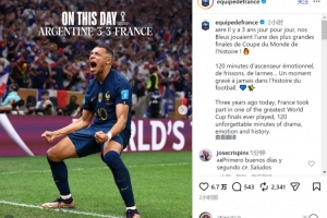 法國隊(duì)官方社媒曬出姆巴佩慶祝進(jìn)球的照片,配文:“3年前的今天,法國隊(duì)參加了史上最精彩的世界杯決賽之一。那是120分鐘令人難忘的戲劇性、情感與歷史時(shí)刻的交織?!?/p>