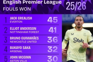 體育資訊12月19日訊 數(shù)據(jù)機構squawka統(tǒng)計了本賽季英超造犯規(guī)次數(shù)榜,被曼城外租的格拉利什居首。