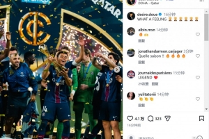 在社交媒體上,巴黎圣日耳曼邊鋒杜埃曬出捧杯照進行慶祝,他寫道:多么美妙的感覺!