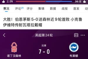 諾丁漢森林上一場(chǎng)0-5不敵伯恩茅斯,本場(chǎng)7-0血洗布萊頓