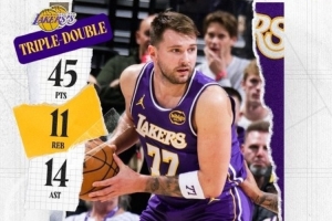 賽后湖人發(fā)布東契奇數(shù)據(jù)海報(bào),并寫(xiě)道:“湖人生涯的首個(gè)40+三雙?!?/p>