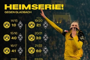 多特官方社媒曬出主場對陣門興的戰(zhàn)績圖片,慶祝球隊(duì)取勝,近13次主場對陣門興,多特全部取勝。