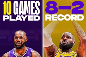 詹姆斯復(fù)出之后,湖人取得8勝2負(fù)的戰(zhàn)績,他個(gè)人的表現(xiàn)也逐漸提升。復(fù)出前五場比賽,詹姆斯場均出戰(zhàn)32.3分鐘拿到15.2分4.0籃板7.0助攻,三項(xiàng)命中率46/33/52%;后五場場均35.8分鐘砍下22.0分7.8籃板7.6助攻,命中率50/37/82%。