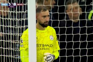比賽第77分鐘,曼城門將多納魯馬用臉擋出了薩默維爾近距離的打門,隨后在防守定位球時特寫給到多納魯馬,他的面部明顯出現(xiàn)了被球擊中的印記。