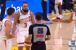 GIF-狄龍被砸 裁判只是給了巴特勒延誤比賽的警告 狄龍非常不滿