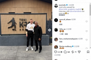 克羅斯社媒曬出合照,配文:“看看誰(shuí)來(lái)青訓(xùn)學(xué)院了?與羅馬里奧的專訪即將發(fā)布。”