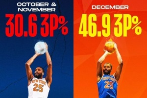 12月至今,布里奇斯三分命中率高達(dá)46.9%,前兩個(gè)月則僅有30.6%