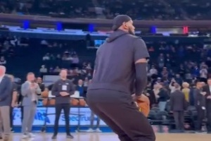 賽前熱身環(huán)節(jié),詹姆斯在中圈位置閑庭信步,抬手飚進(jìn)超遠(yuǎn)三分,展示了超強(qiáng)的力量和手感。