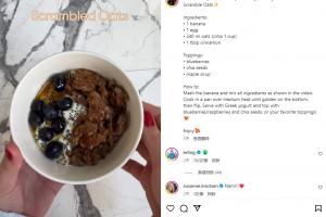 哈蘭德女友做的是炒燕麥,用的食材包括香蕉、雞蛋、燕麥、肉桂,配合希臘酸奶、藍(lán)莓、奇亞籽和楓糖漿食用。