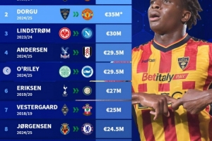體育資訊2月2日訊 曼聯(lián)正式官宣簽下多古,總價(jià)3500萬歐,德轉(zhuǎn)也盤點(diǎn)了丹麥球員歷史轉(zhuǎn)會(huì)費(fèi)榜,其中霍伊倫居首,多古次席,具體如下: