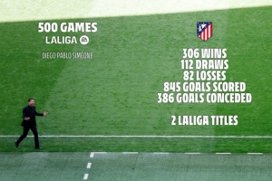 據(jù)馬競統(tǒng)計(jì),在這500場比賽中,西蒙尼收獲了306勝112平82負(fù)的出色戰(zhàn)績,一共打進(jìn)845球、丟掉386球。