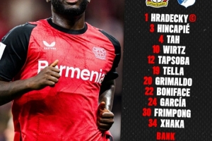 勒沃庫森首發(fā):1-赫拉德茨基、3-因卡皮耶、4-若納坦-塔、10-維爾茨、12-塔普索巴、19-泰拉、20-格里馬爾多、22-博尼法斯、24-阿萊克斯-加西亞、30-弗林蓬、34-扎卡