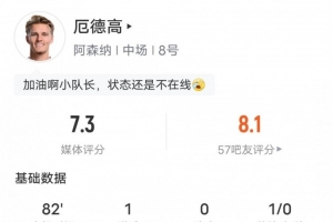 體育資訊2月3日訊 英超第24輪,阿森納主場(chǎng)迎戰(zhàn)曼城,厄德高首發(fā)出戰(zhàn),貢獻(xiàn)1進(jìn)球,2搶斷,1解圍,評(píng)分7.3。