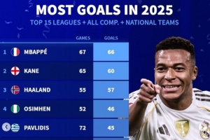 體育資訊1月2日訊 2025年已經(jīng)過去,《轉(zhuǎn)會市場》也統(tǒng)計了2025前15聯(lián)賽球員的俱樂部+國家隊各項賽事總進球情況,皇馬前鋒姆巴佩領(lǐng)跑。