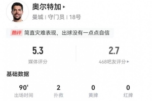 體育資訊2月3日訊 曼城在本輪英超1-5慘敗阿森納,奧爾特加本場(chǎng)數(shù)據(jù)如下: