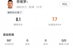 本場比賽勞塔羅為國米首發(fā)出戰(zhàn),全場比賽下來他有三次進(jìn)球被吹,上演另類“帽子戲法”。最終他收獲8.1的評(píng)分,為全隊(duì)第二高,僅次于扳平比分的德弗里。