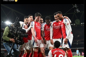 阿森納社媒曬出斯凱利模仿哈蘭德慶祝時,其余球員圍繞著他的照片,并寫道:這支球隊。