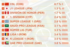 CIES統(tǒng)計(jì)數(shù)據(jù)基于當(dāng)前賽季(非跨年賽事如中超則為2024賽季)出生于2004年以后的球員在所有比賽出場(chǎng)時(shí)間百分比。中超以0.7%排在“第一”,日本J聯(lián)賽、秘魯聯(lián)賽緊隨其后,沙特、韓國(guó)等聯(lián)賽同樣榜上有名。