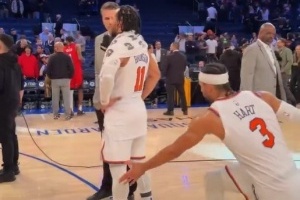 賽后,當(dāng)布倫森在場邊接受采訪的時(shí)候,哈特拍了他的屁股,然后瘋狂逃串。