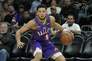 此役,布克出戰(zhàn)46分半,投籃18中9,三分8中3,罰球14中13,得到34分3籃板4助攻。