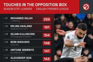 體育資訊2月5日訊 Squawka統(tǒng)計(jì)了本賽季英超球員在對(duì)方禁區(qū)內(nèi)觸球情況,薩拉赫斷崖領(lǐng)跑。