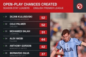 本賽季英超運動戰(zhàn)創(chuàng)造機會榜: