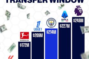 CBS統(tǒng)計冬窗五大聯(lián)賽支出,曼城超過了法甲、德甲和西甲整個聯(lián)賽的支出,英超除去曼城外,花費(fèi)仍排在五大聯(lián)賽榜首??