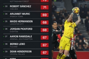 體育資訊2月5日訊 數(shù)據(jù)網(wǎng)站Squawka盤(pán)點(diǎn)了本賽季英超撲救次數(shù)榜,其中布倫特福德門(mén)將弗萊肯高居榜首,具體榜單如下:
