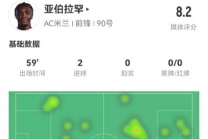 體育資訊2月6日訊 米蘭在本場3-1領先羅馬,亞伯拉罕本場數(shù)據如下: