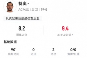 體育資訊2月6日訊 米蘭在本輪意大利杯3-1擊敗羅馬,特奧本場(chǎng)數(shù)據(jù)如下: