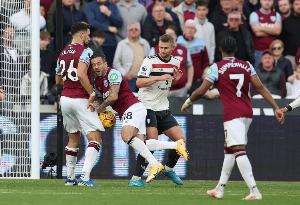 判罰:庫特判罰點球,鮑文主罰命中,西漢姆戰(zhàn)勝曼聯(lián)。