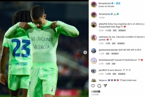 他也在進球后掀開球衣,露出內(nèi)衣上的“我們不要忘記瓦倫西亞”字樣,并且在賽后通過社媒曬照并配上????符號。