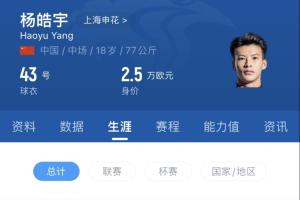 楊皓宇出生于2006年5月25日,司職中場,2024賽季代表申花在U21聯(lián)賽出場17次,打入5球,入選U19國家隊。