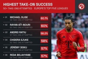 體育資訊2月8日訊 squawka統(tǒng)計了本賽季五大聯(lián)賽過人成功率情況,奧利塞居首,而五大聯(lián)賽成功過人次數(shù)最多的亞馬爾并未進(jìn)入前十。