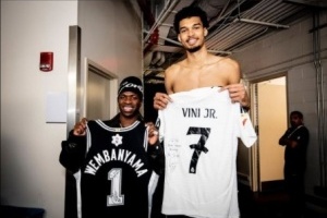 皇馬球星維尼修斯正在美國度假,他觀看了馬刺客場對陣尼克斯的圣誕大戰(zhàn)。在個(gè)人社媒,維尼修斯曬出與馬刺球星文班亞馬的合照,兩人互贈(zèng)簽名球衣,維尼修斯同時(shí)配文:“新的傳奇!”