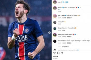 克瓦拉茨赫利亞也在賽后通過社媒曬出自己的慶祝照,并配文:“巴黎充滿了魔力。”