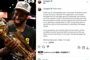 維金斯寫道:“感謝你們帶給我難忘的歲月。能穿上這件球衣,代表這個球隊,并與如此出色的隊友和教練們一起競爭,是我的榮幸。從我來到這里的那一刻起,我就感受到了灣區(qū)和整個勇士大家庭的熱情支持,這對我來說意義重大。在2022年贏得冠軍,以及在這樣的環(huán)境中在場上和場下的成長,都是我將永遠珍惜的經(jīng)歷。