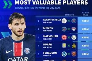 體育資訊2月8日訊 《轉(zhuǎn)會市場》統(tǒng)計了今年冬窗轉(zhuǎn)會身價最貴球員情況,克瓦拉茨赫利亞居首。