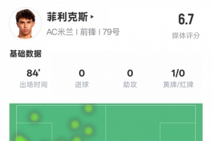 體育資訊2月9日訊 意甲聯(lián)賽第24輪,AC米蘭客戰(zhàn)恩波利,菲利克斯首發(fā)出戰(zhàn),送出1次關(guān)鍵傳球,4次過人成功,但有17次丟失球權(quán),5次射門4次打偏,錯失2次進(jìn)球機(jī)會,還因?yàn)榧偎こ缘揭粡堻S牌,評分6.7。
