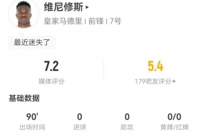 體育資訊2月9日訊 皇馬在本輪西甲1-1戰(zhàn)平馬競(jìng),維尼修斯本場(chǎng)數(shù)據(jù)如下: