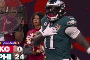 體育資訊2月10日訊 今日NFL超級碗,老鷹外接手AJ-布朗達(dá)陣后秀起了詹姆斯的霸王步慶祝動作。