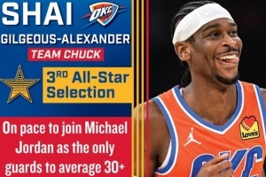 據(jù)統(tǒng)計(jì),亞歷山大有望成為NBA歷史上第二位連續(xù)三個(gè)賽季場(chǎng)均得分30+、且命中率50%+的后衛(wèi),第一個(gè)是喬丹。
