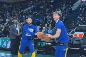賽前熱身環(huán)節(jié),庫里和波杰姆斯基再次祭出經(jīng)典熱身動(dòng)作。兩人碰球后一起出手先后命中三分,隨后他們開心地撞胸慶祝。