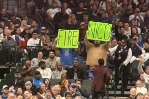 比賽中,一位球迷在唱歌環(huán)節(jié)吸引了鏡頭,在鏡頭給他之后,他迅速不唱了,明顯嘴型表示:“解雇尼科(哈里森,獨行俠經(jīng)理)”,隨后,這位球迷被保安驅(qū)逐(下圖)。