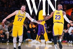 賽后,詹姆斯和東契奇同時登上湖人官方的贏球海報,官方寫道:“六連勝啦。”