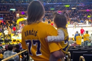 賽后東契奇的未婚妻Anamaria Goltes曬出自己與女兒Gabriela在場(chǎng)邊觀看比賽的照片,配文:新篇章????。